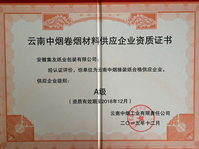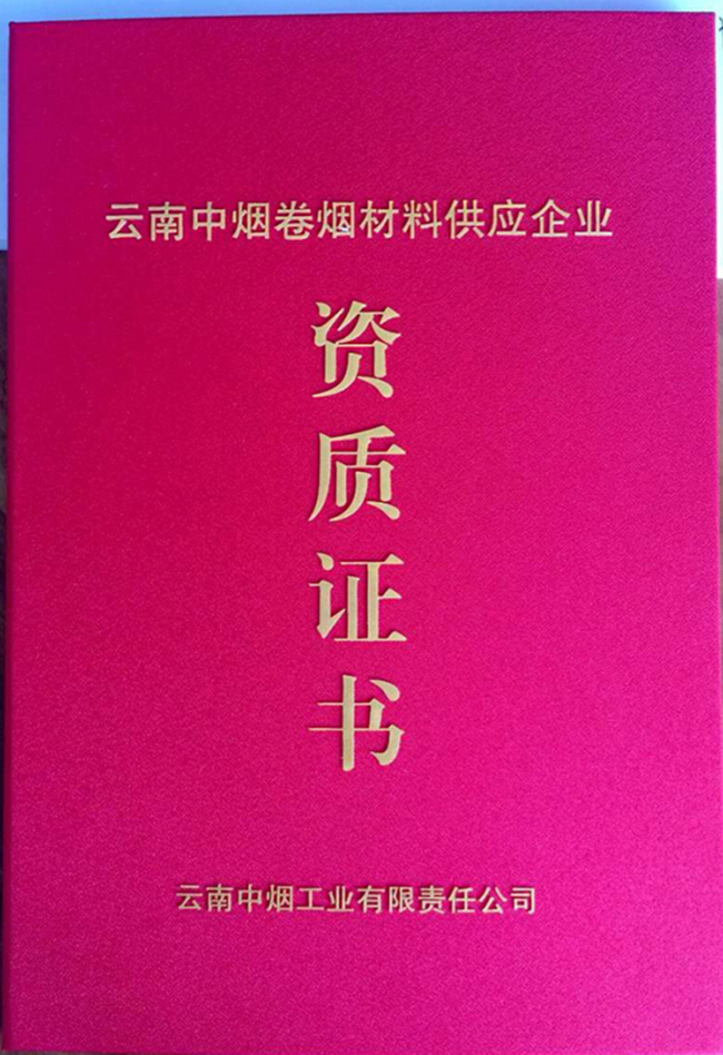 熱烈祝賀我公司榮獲云南中煙卷煙材料供應(yīng)企業(yè)資質(zhì)A級(jí)證書